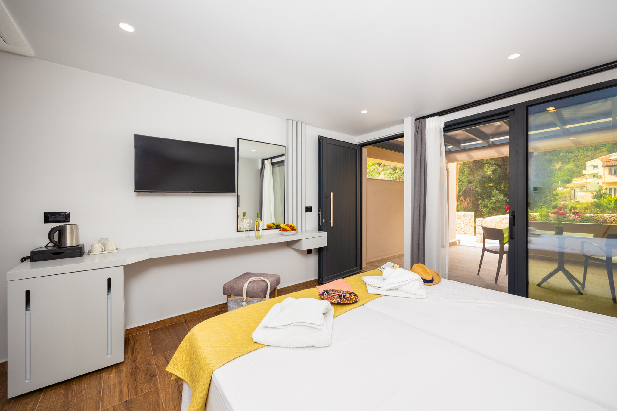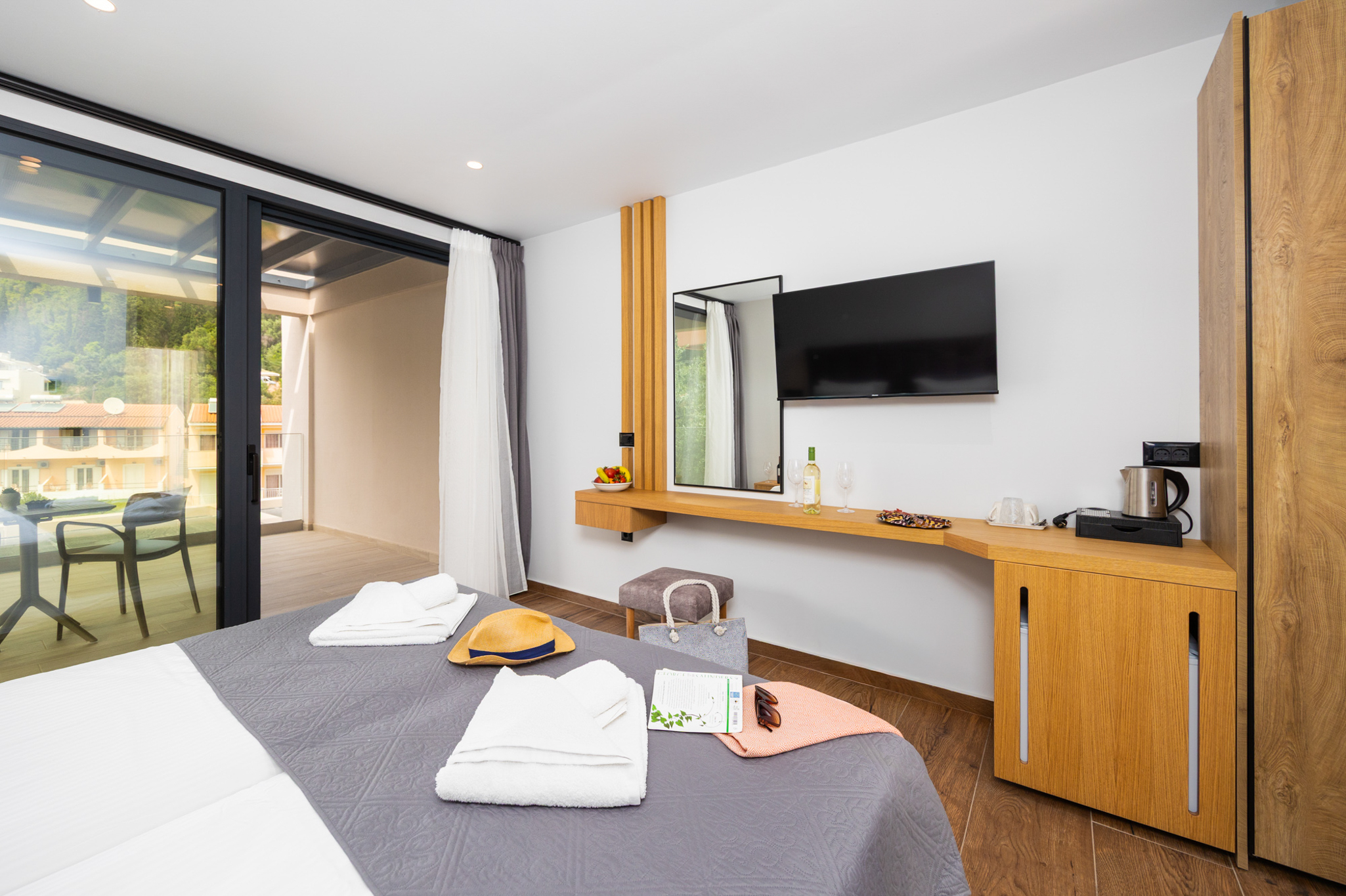 Nobile Hotel is a stylish boutique hotel located in the heart of Agios Gordios, just a short walk from the famous sandy beach. Offering modern and comfortable rooms in a relaxed coastal setting, the hotel is ideal for couples and travellers seeking a peaceful yet convenient stay. Guests also have access to the swimming pool and bar of Irene Apartments, located just 50 metres from the hotel, where they can enjoy the pool and relax with snacks and refreshments from the snack bar. With easy access to local restaurants, beach bars, and shops, guests can fully enjoy the beautiful sunsets and laid-back charm of Corfus west coast.