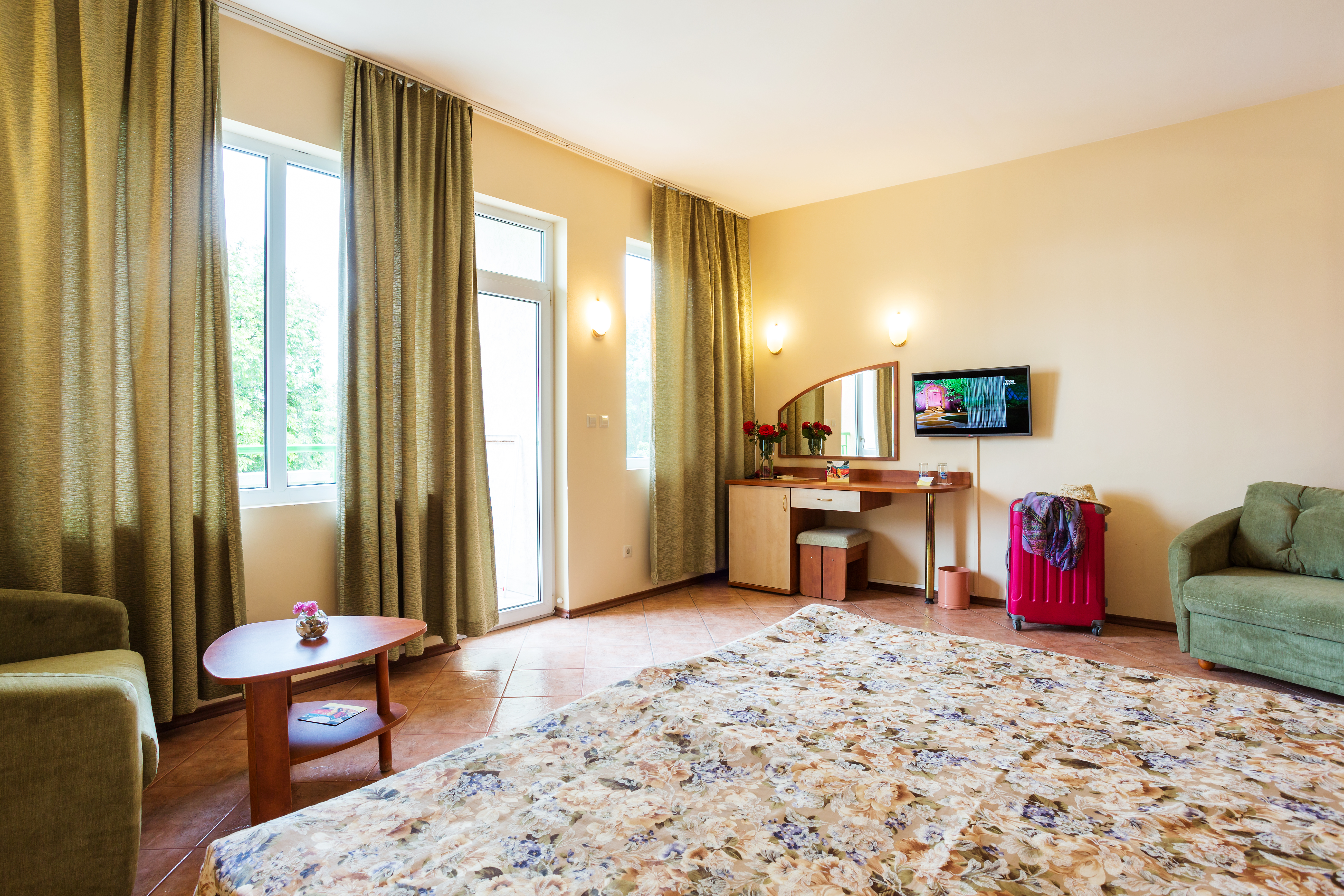The Hotel Ljuljak, nestled in the heart of Golden Sands resort, is a short stroll from the beach and central promenade. Conveniently located on the Varna-Albena road, guests enjoy easy bus access to both cities. The hotel offers double rooms and suites, each with modern furnishings and a private balcony showcasing either sea or park views. Amenities include satellite TV, air conditioning, a mini-fridge, and a private bathroom. Guests can unwind at the outdoor pool and pool bar, indulge in a massage, or enjoy the playground. The on-site Restaurant Ljuljak boasts a spacious terrace and serves a buffet breakfast and dinner, along with à la carte options featuring national and continental cuisine. An all-inclusive package offers meals, drinks, and snacks throughout the day. Additional hotel features include a reception with safe and currency exchange, and on-site parking.